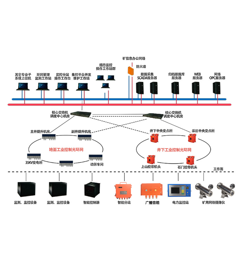 建設煤礦萬兆工業(yè)以太環(huán)網(wǎng)系統(tǒng),實現(xiàn)井下生產(chǎn)與井上辦公協(xié)同發(fā)展,生產(chǎn)子系統(tǒng)實現(xiàn)平臺化操作,統(tǒng)一管理、統(tǒng)一認證、統(tǒng)一風格、統(tǒng)一標準,實現(xiàn)系統(tǒng)操作、界面數(shù)據(jù)的大融合;工作人員能通過智能化綜合管控平臺查看所有原有系統(tǒng)的生產(chǎn)、報警等信息,實現(xiàn)調(diào)度報表自動化、安全生產(chǎn)過程管控自動化。