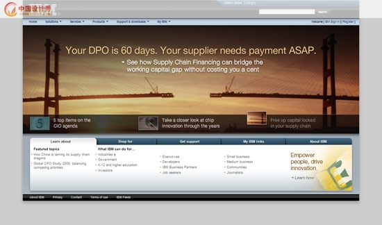 我們看到IBM的設(shè)計(jì)色彩并不多,但是層次感就卻是有了。他這里有黑色、淡藍(lán)色、白色、其中黑色與淡藍(lán)色之間的對(duì)比較為吸引眼球。并且我們發(fā)現(xiàn)黑色是純黑、而淺藍(lán)色卻是屬于高亮的那種。這種強(qiáng)對(duì)比對(duì)人的視覺是有一定吸引力的。并且黑白灰三者都有了。加上三者之間的比例并非均等的。而我們?cè)谠O(shè)計(jì)的時(shí)候通常會(huì)使用一些灰度相近的色彩放在一起,并且飽和度也不高,所以最后出來(lái)的作品只能是灰頭土臉。這樣的網(wǎng)站我就不找例子了,找誰(shuí)的來(lái)說(shuō)誰(shuí)也不開心。當(dāng)然也包括我自己。呵呵,大家可以去我的作品集去找找,一定有那種灰頭土臉的東西。