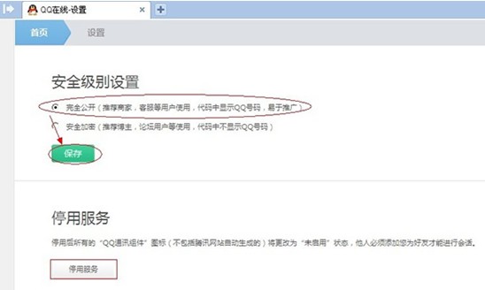 2、點擊“設置”按鈕,選擇安全級別為“完全公開”,保存。此時QQ客戶就會恢復在線狀態,可以接收來自網頁上的臨時會話。請留意下面“停用服務”按鈕,如果點擊此按鈕,將會停止所有的網頁QQ在線服務,因而如果要停用某個網頁的QQ在線服務,可以點擊此按鈕。