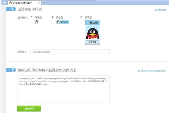 3、點擊網站右上方的“QQ通訊組件”按鈕,可以根據自己的喜好選擇相應的QQ在線客戶顯示形式。此步驟需要將代碼復制黏貼到你的網站代碼中方可啟用。途徑:原網站QQ在線客服代碼==》重新設置后的QQ在線客戶代碼==》保存生成即可。不熟悉網站代碼的可以請網站建設公司幫忙設置。