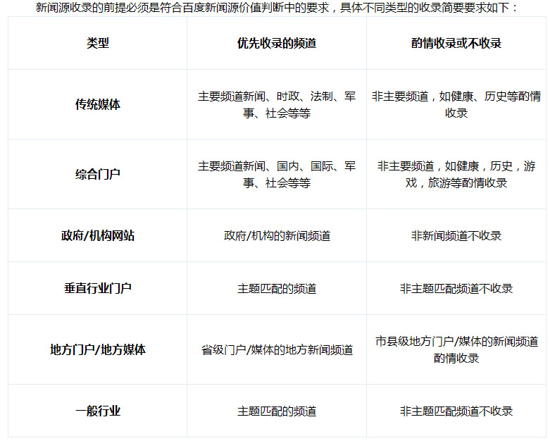 新聞源收錄的前提必須是符合百度新聞源價值判斷中的要求,具體不同類型的收錄簡要要求如下: