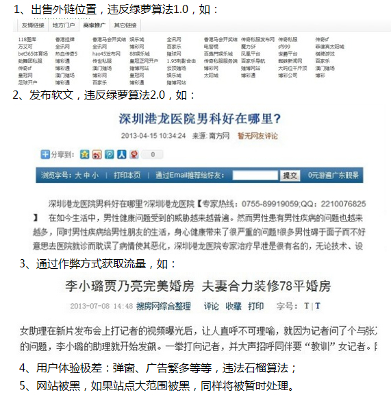 違反如下原則的站點將視嚴重程度受到不同程度的懲罰:降低搜索引擎系統(tǒng)評價、目錄或站點屏蔽清理出新聞源、整站屏蔽清理出新聞源。具體原則包括但不限于如下: